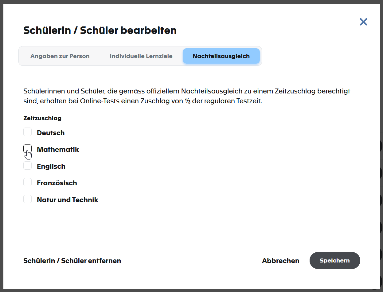 Um einen Zeitzuschlag zu vermerken, wählen Sie im Dialog zum Bearbeiten von Schülerdaten den Reiter «Nachteilsausgleich» («Schule» > Reiter «Klassen» > Klasse aufklappen > Schüler bearbeiten). Wählen Sie dort dasjenige Fach oder diejenigen Fächer aus, für welche ein Zeitzuschlag gewährt werden muss.